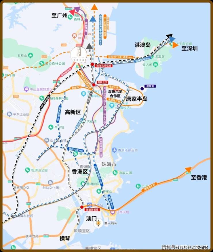 四轨道:广珠城际(已通车)、广州地铁 18 号线延长线(在建中)、珠海2号线(规划中)、深珠城际(规划中)