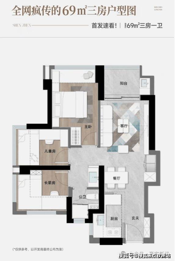 据网传户型图,69㎡为三房一卫,客厅直出阳台,厨房靠近玄关,买菜回家动线短;卧室集中在一侧,动静分区清晰,没有“暗房”,比较通透。