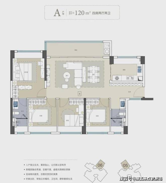 120㎡4房2卫户型,本以为是南北通透户型,结果却是横厅设计。如此的收益点是拥有一个11.4米的超大阳台,观景视野辽阔,且没了竖厅必备的走廊,可利用空间进一步变大。