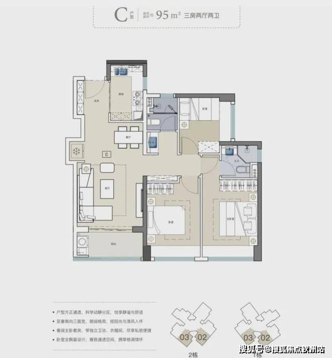 95㎡3房2卫户型,与75㎡户型设计理念相似,LDKB布局的餐客厅,开阔灵活、易于设计。亮点是有两个卧室与阳台同侧,均为南向,采光充足。