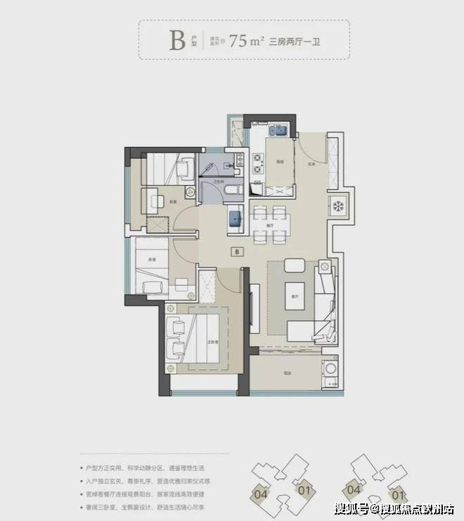 75㎡3房1卫户型,门槛最低的户型,LDKB一体化设计,外接阳台为南向,主卧有同向飘窗,采光通风俱佳,空间利用率也很高。整体设计相对主流,三个卧室面积分布也比较合理,没有为一些不必要的噱头而牺牲实际居住的舒适度。