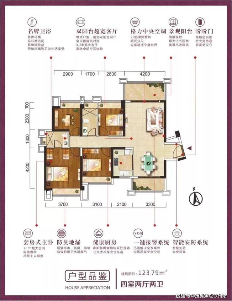 (2)四居:123㎡左右,南北通透,主卧带卫,双阳台设计。