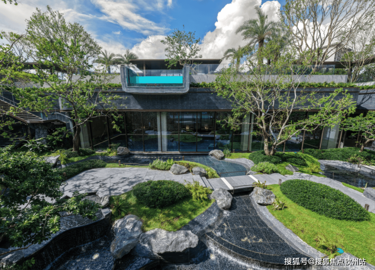 往里便是度假感下沉庭院,通过与自然地形结合叠水叠石,形成特色森系庭院。