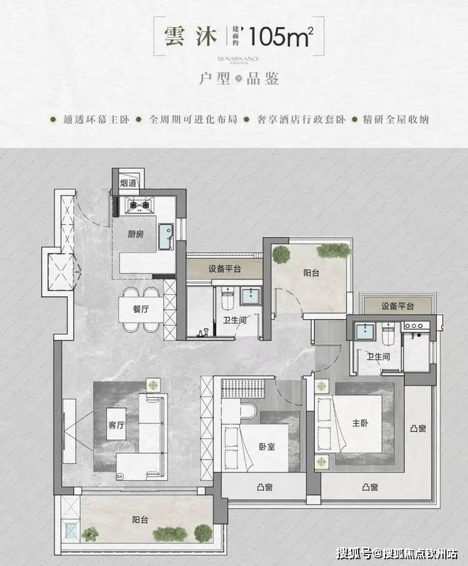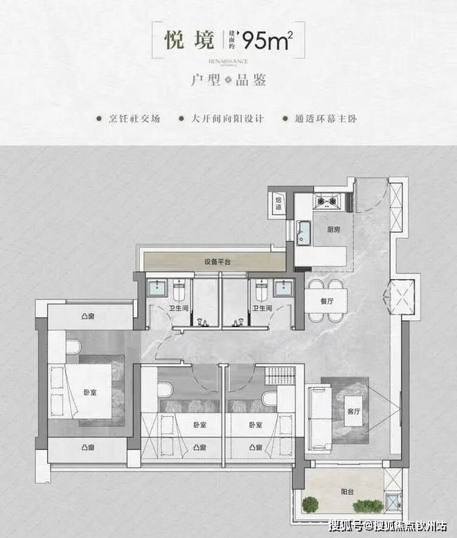 【95㎡3房2卫】:竖厅户型,不用阳台改造,但赠送面积也很高,设备平台可利用。3房间全向阳,主卧南北通透,西南侧飘窗正对楼体刚好可做衣柜,户型无对视及遮挡情况。