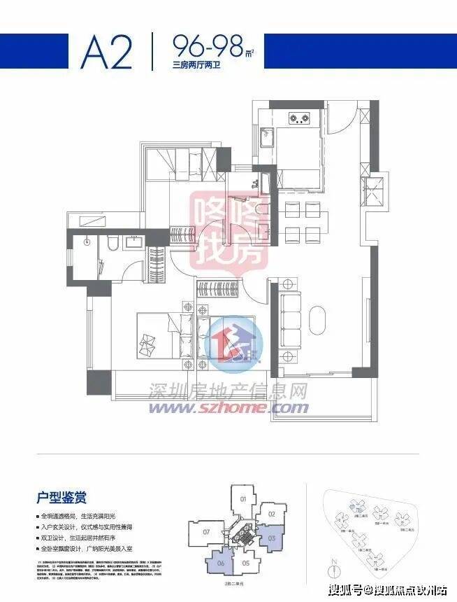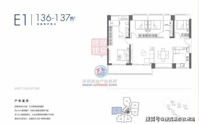 其中,住宅约17万㎡,包含6栋单元楼,共计约1508户。1栋2单元(46F)3梯5户,其余的1栋1单元(47F)、2栋1/2单元(47F)和3栋1/2单元(52-53F)均为3梯6户。同时在4栋规划了约1.2万㎡集中商业,另配建有一所18班幼儿园。