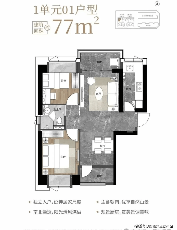 主打77-114㎡2-4房,覆盖刚需到改善需求,得房率惊人(77㎡户型实际套内约76㎡,114㎡户型实际使用面积接近140㎡),通过设备平台、飘窗、双阳台等不计容空间实现“空间膨胀”,实现高得房率。