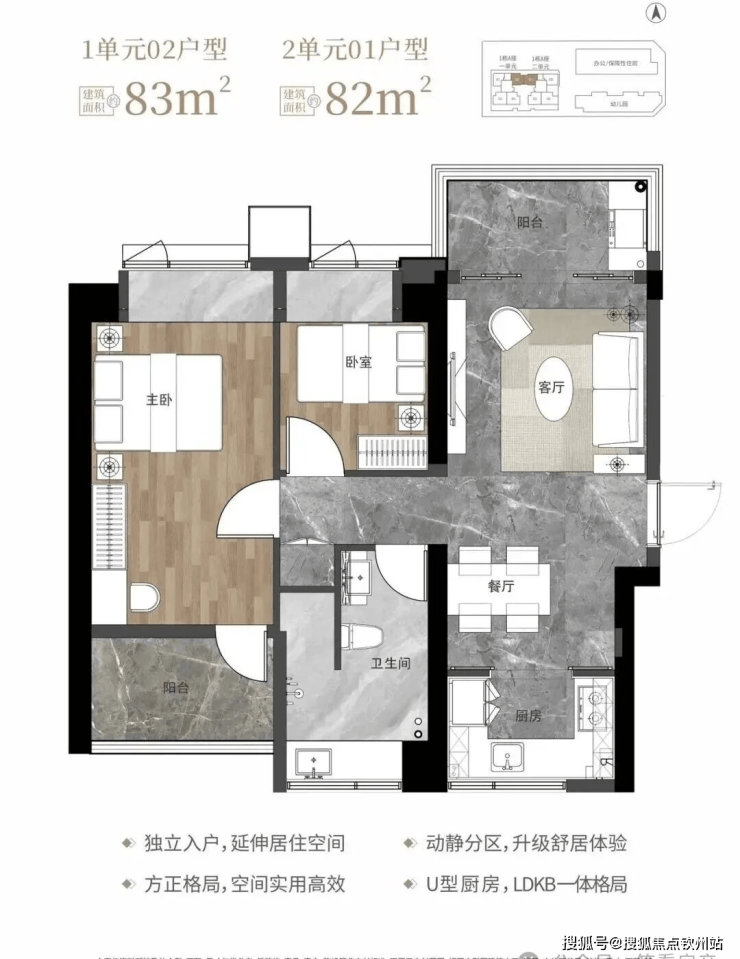 1栋1单元03、04户型/1栋2单元03户型,设计的是经典竖厅格局,客厅3.6米开间,LDKB一体化设计,动静分区,三开间朝南,9.4米面宽,二字型厨房,卫生间干湿分离,阳台正南朝向。