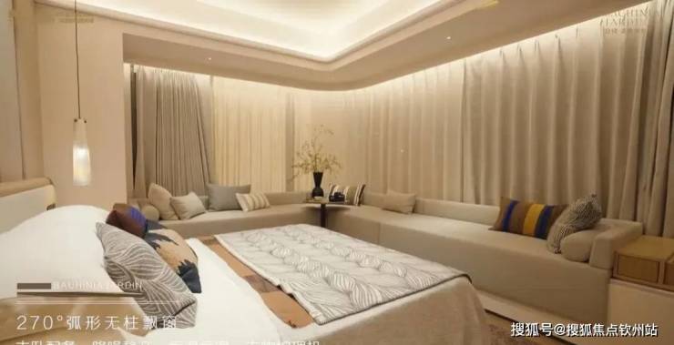 横厅四房,东南朝向,空间感开阔,采光通风佳,没有大面积的走廊或过道,节省了空间,动线也更加流畅。主卧拥有更加开阔的景观面,大面积的弧形无柱飘窗,将外部的自然光线引入室内,空间更加明亮宽敞。