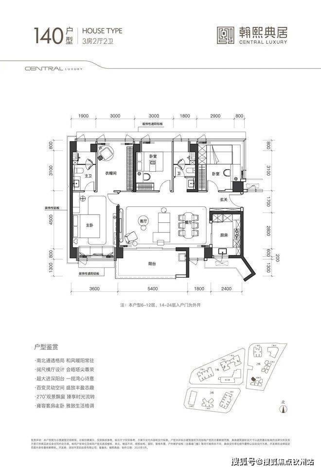 (1)105㎡3房2卫:双龙抱珠格局,朝东/南,阳台开间6.5米,适合刚需家庭。