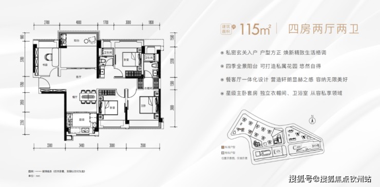 建面约115㎡4房2厅2卫户型,则将舒适度往上再拉一层。