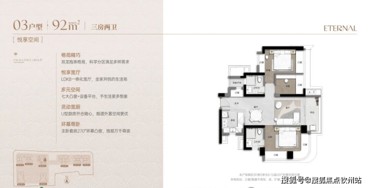 其中,项目最小面积92㎡产品,做到了双龙抱珠的户型设计,充分将户型内部空间进行展开,优化动静分区的同时,还实现了270°的小面积奢阔主卧景观。