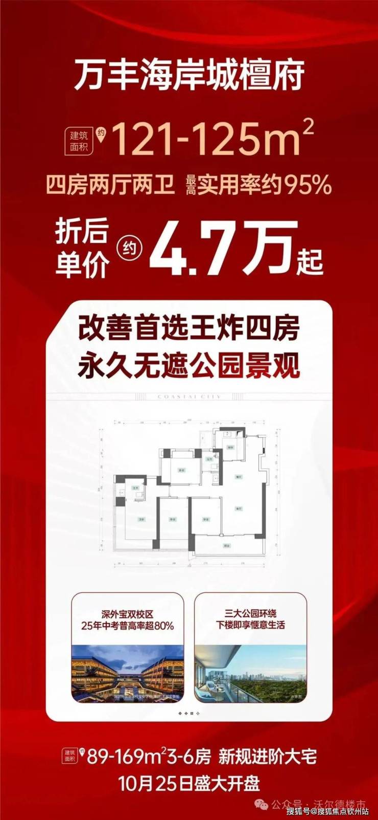 本次推售的万丰海岸城檀府(北地块),容积率6.79,绿化率40%,共由4栋46-47层住宅组成,其中3栋1单元/2栋2单元商品房45层,3栋2单元商品房46层,2栋1单元47层,规划1所12班幼儿园。