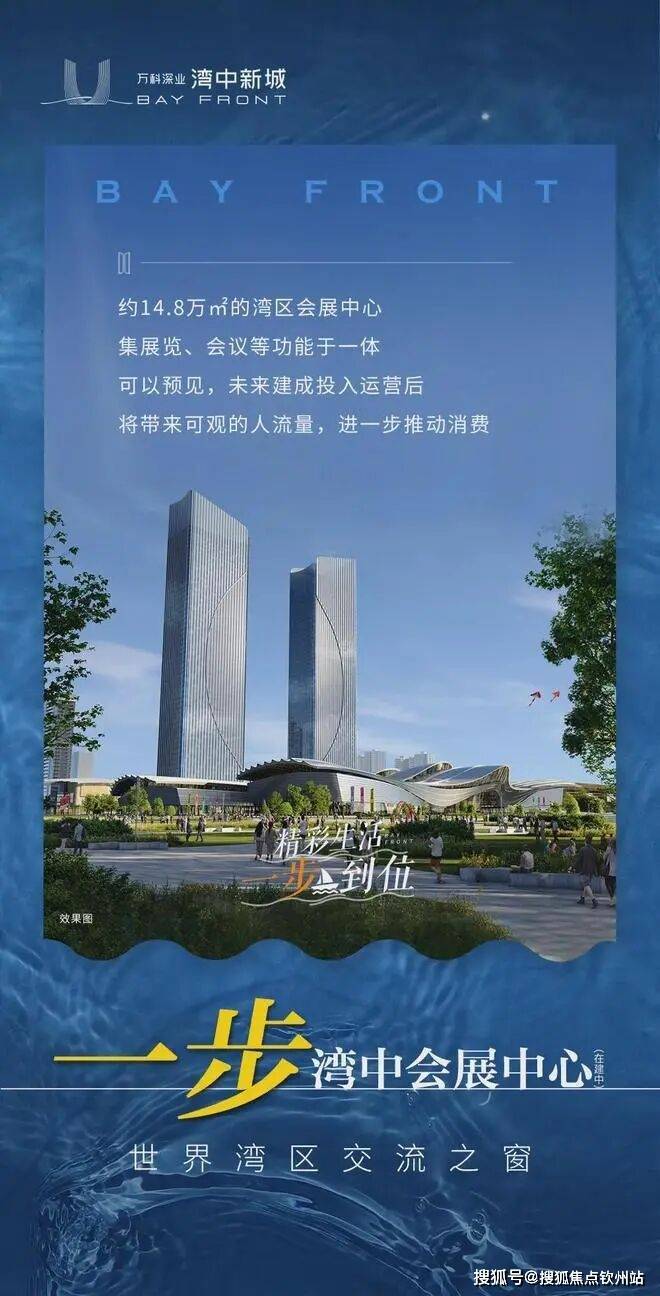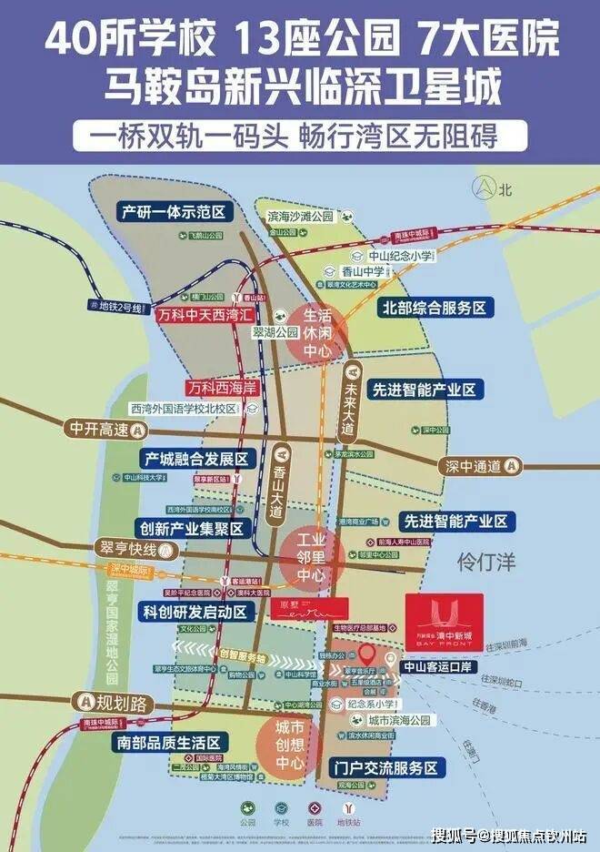 由万科深业·湾中新城配建的中山客运口岸,被称为“水上版深中通道”,将与深中通道同期开放;由万科承建的公用大厦已于今年3月交付,办公人数预计超1000人;建面约9.3万㎡湾中水街,预计今年12月试运营;中山纪念小学将于12月达到竣备条件;两栋约249米高的地标双子塔“未来之门”,将成为马鞍岛的封面与中山市的东大门,其中涵盖约25万㎡甲级写字楼以及约4.5万㎡五星级酒店,并配套14.8万㎡湾中会展中心,集展览、会议等功能于一体,投入运营后预计将会撬动百万级别的人流量,带来大量客流和就业机会。