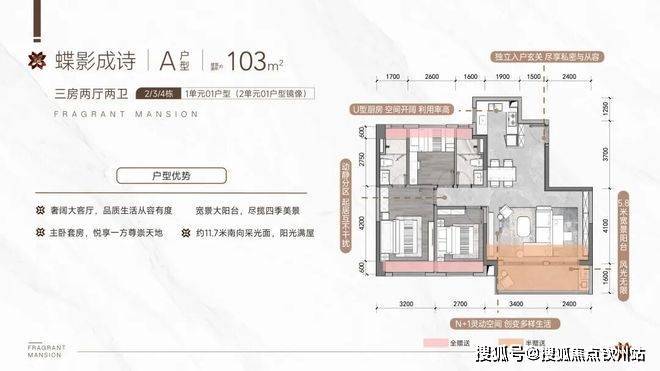 (2)103㎡三居室:全明格局,功能分区明确,兼顾居住舒适度。