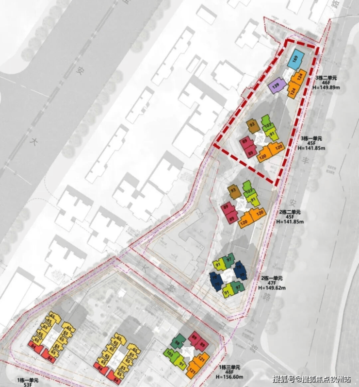 规划建设3栋(48-53层)超高层住宅,总户数1396户,其中保障房1104户,普通商品房住宅292户,机动停车位1411个。