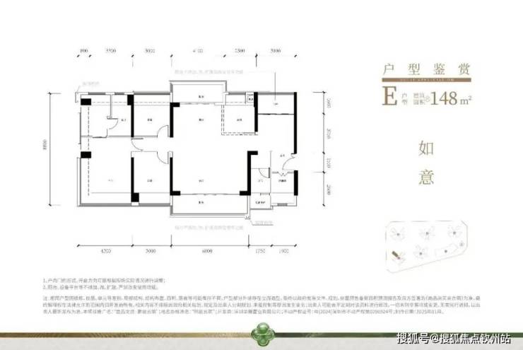 148㎡的4房2厅2卫,设计的是横厅南北通透格局,进门赠送约5㎡的前室入户,不在户型图内,客厅6米开间,LDKB一体化设计,横向宽敞大客厅,南北双阳台,可以改5房,主卧270°飘窗大套间,U型厨房,公卫三段式分离,得房率约79.45%(不含赠送),阳台主朝西南向。
