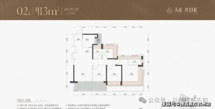 113㎡4房2卫:6.4米阳台联动小房间,如果只需要3个房可改为大客厅,景观无敌,得房率超100%,层高3.15米,厨房外带设备平台可做生活阳台,北向的次卧面积更加适宜,还采用了双面飘窗。