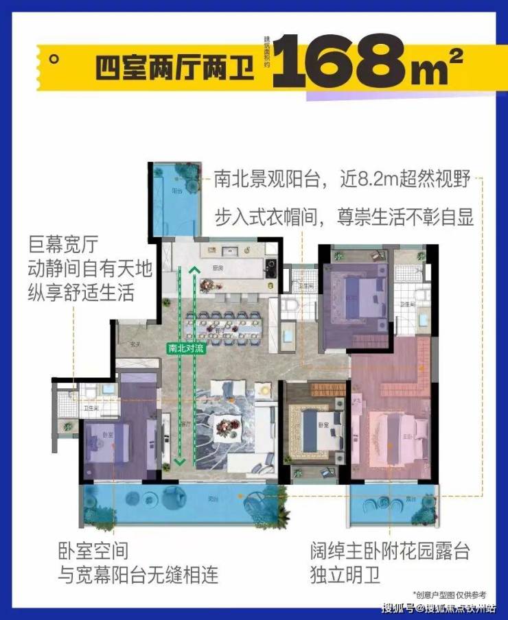 (3)168㎡:4室2厅2卫,宽幕大平层,南北通透,约5m面宽会客厅,约8.2m阔景阳台,纵揽180度环幕;