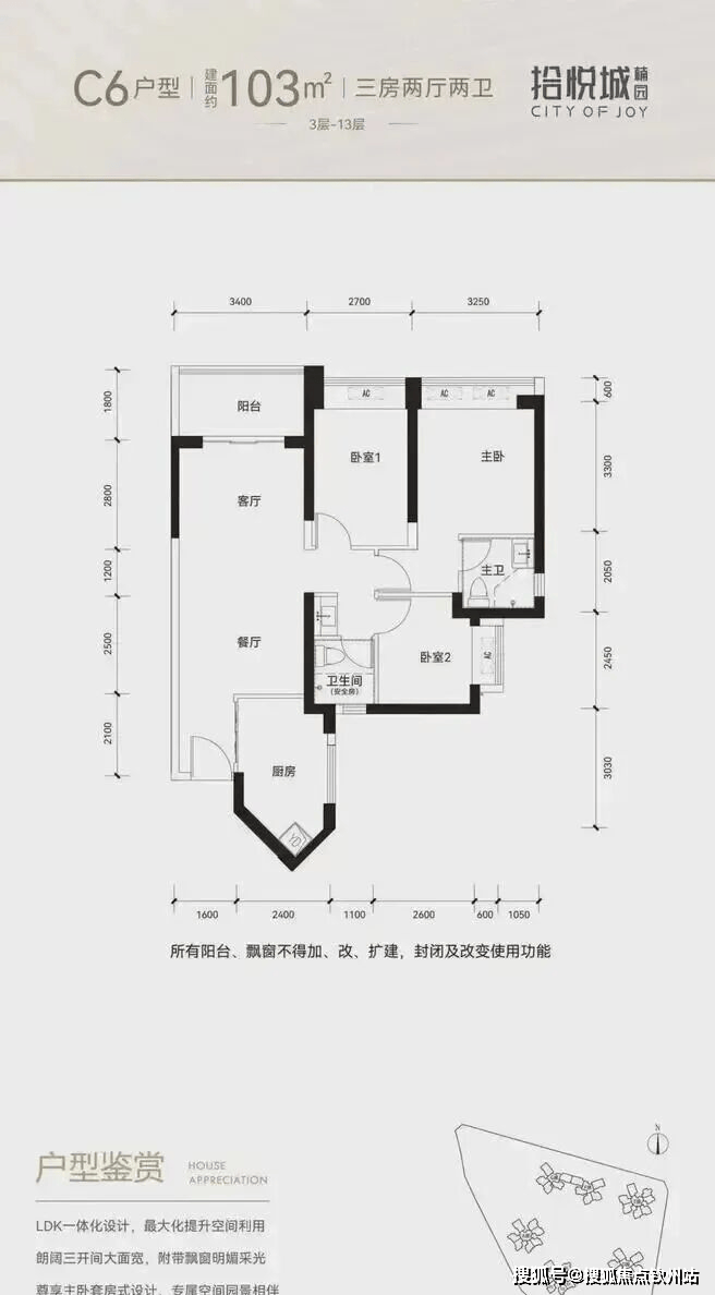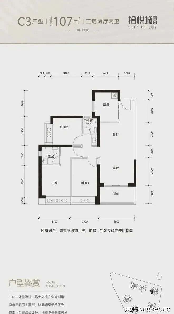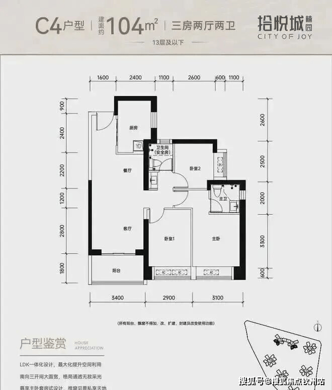 100平三房:设计的是竖厅格局,进门入户玄关,客厅3.4米开间,LDKB一体化设计,3个卧室分别做到了3米/2.9米/2.5米的宽度,U型厨房,公卫三段式分离,得房率:77.14%(不含赠送),阳台1.8米宽度,西南或东南朝向。
