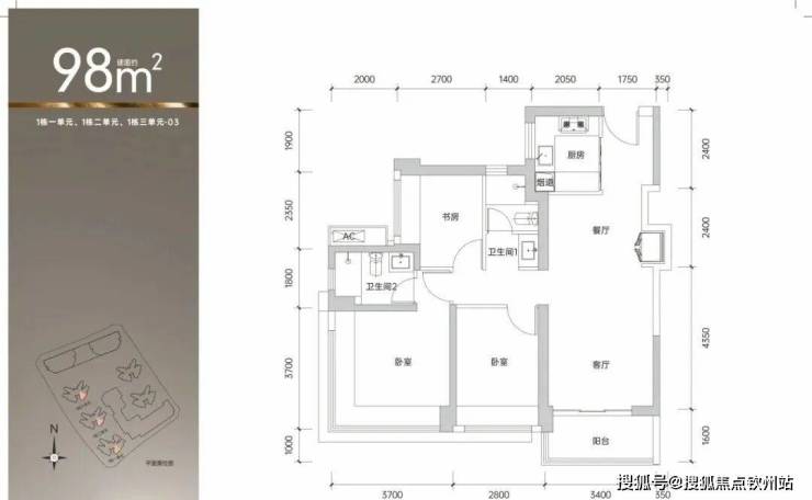 98㎡的3房2厅2卫,1栋1/2/3单元03.05户型,设计的是经典竖厅格局,客厅3.4米开间,三开间朝南,3个卧室分别做到了主卧14.3㎡/次卧10.36㎡/次卧6.75㎡(包含墙体飘窗),得房率约90%(包含赠送),东南或西南朝向。