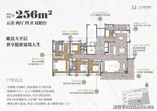 屿境一共只有16席,面积大约256平米,户型均面朝大海,坐拥270度视野,可远观整个黄金内湾、深中通道,也可俯瞰小区园林美景。户型阔绰设计了2梯1户、专梯入户。户型独特设计在于客厅拥有270°转角边厅,通过玻璃幕墙引入室外景致。并采用餐厨客LDK一体化设计,空间感大方开扬。15.4米L型超长景观阳台则是又一大亮点,可以打造成一个空中花园或星空茶室。