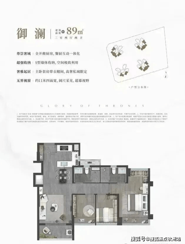 89㎡的3房2厅2卫,设计的是新版竖厅格局,客厅开间3.5米,LDKB一体化,S墙设计预留冰箱位,约11米四面宽超幕视野,主卧套房带衣帽间,U型全开敞厨房,得房率:78.99%(不含赠送),有西北、西南、东北、东南4个朝向。