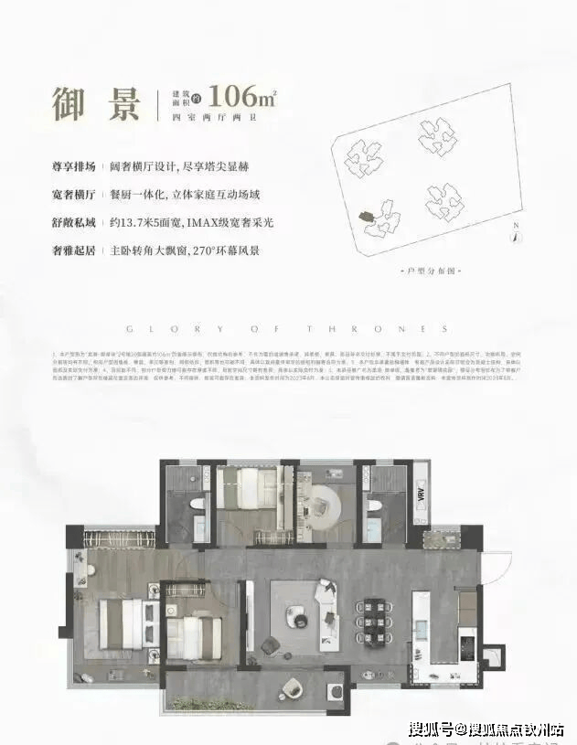 106㎡的4房2厅2卫,设计的是横厅南北通透格局,客餐厅开间5.6米,餐厨一体化,约13.7米超幕视野,超长阳台,主卧转角270°大飘窗,只有2栋07户型才有,得房率:78.99%(不含赠送),阳台主朝西南向。