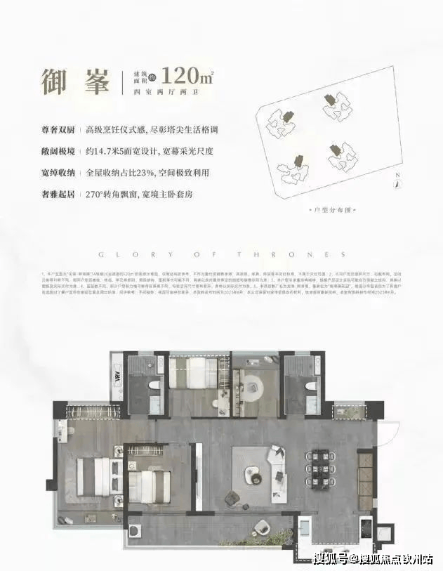 120㎡的4房2厅2卫,设计的是横厅南北通透格局,客餐厅开间8米,约14.7米超幕视野,超长阳台,主卧转角270°大飘窗,U型厨房,得房率:78.99%(不含赠送),阳台主朝西南或东南向。