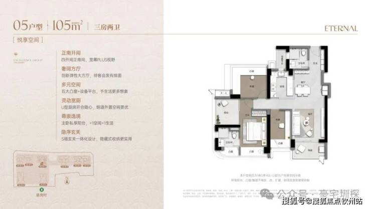 173m²的4房2厅3卫+家政间,竖厅类双龙抱珠格局,独立电梯厅入户约8.13㎡,客厅5.55米开间,LDKB一体化设计,主卧套房270°环幕凸窗+私享阳台,八大凸窗+设备平台+家政间,U型厨房,公卫三段式干湿分离。阳台正北朝向看会展中心+市民广场,得房率76%(不含赠送,套内面积131.98㎡)。