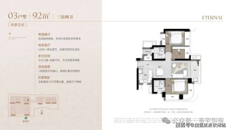 92m²的3房2厅2卫,双龙抱珠格局,客厅3.2米开间,LDKB一体化宽厅,主卧套房270°环幕凸窗,七大凸窗+设备平台,U型厨房,卫生间干湿分离。阳台正东朝向,得房率76%(不含赠送,套内面积69.86㎡)。