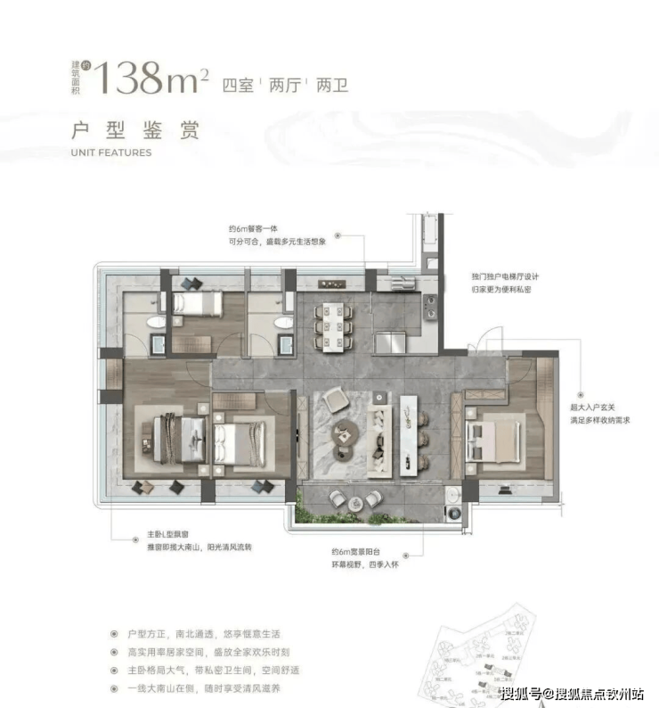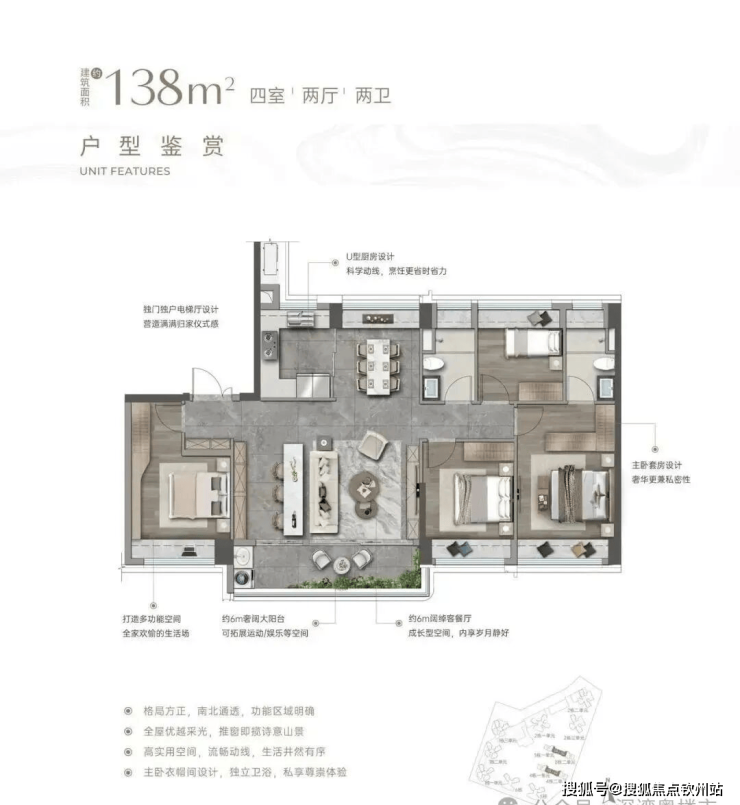 入户玄关巧妙隔绝视线,隐私感拉满。客餐厅南北通透,大客厅除传统布局外,还增设茶台区域,两者共享 6 米多宽景阳台,搭配 U 型厨房与方正餐厅,公区气场全开。
