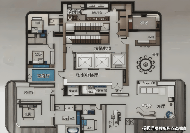 - 510㎡一层一户顶豪:3梯1户的专属配置,层高3.6米,5+1房3厅5卫的阔绰格局,搭配165.77米的地标高度(43层),将"私密性"与"仪式感"拉至顶点。这种"一户独占整层"的设计,不仅是空间的奢侈,更是圈层纯粹性的象征。