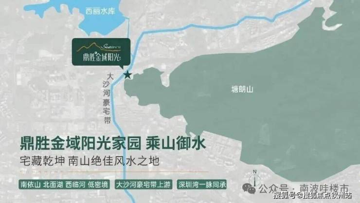 宅藏乾坤,乘山御水:项目南依塘朗山,北面西丽湖,西临大沙河,推窗观山,临街瞰河,不仅营造了豪宅级居住体验,更是南山绝佳风水之地。