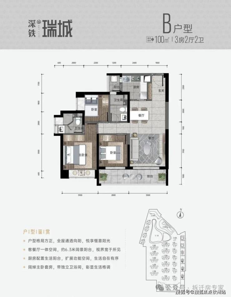 100㎡的3房2厅2卫,B户型,设计的是经典竖厅格局,客厅3.5米开间,3个卧室分别做到了主卧12.45㎡/次卧7.3㎡/次卧6.06㎡(实测面积,去掉墙体),客厅连接次卧出6.3米长的阳台,厨房还带1个生活阳台,得房率约:75.76%(不含赠送),西南朝向。