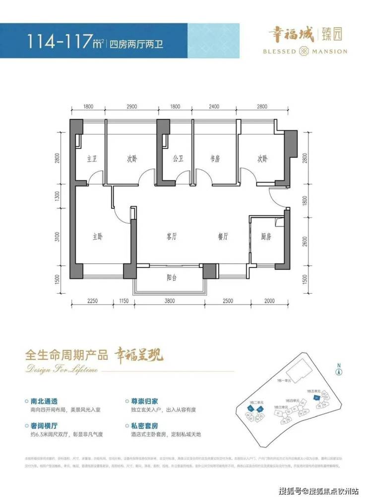 114-117㎡:4房2卫横厅南北通透,客餐厅6.3米开间,全屋8个飘窗,主卧15.35㎡。