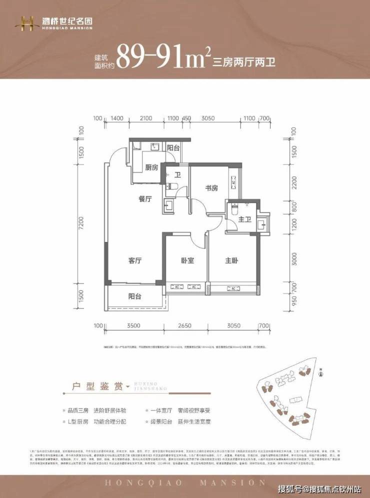 91㎡的3房2厅2卫,设计的是竖厅南北通透格局,客厅3.5米开间,LDKB一体化设计,3个卧室分别做到了3.05米/2.6米/2.55米的宽度,L型厨房带1个小生活阳台,卫生间干湿分离,阳台主朝正北向。