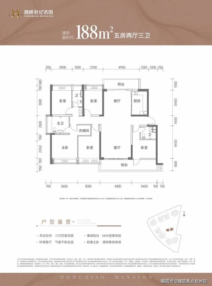 188㎡的5房2厅3卫,设计的是竖格局,南北通透双阳台,客厅4.3米开间,LDKB一体化设计,双主卧套间设计,5个卧室分别做到了3.65米/3.4米/3.05米/2.9米/2.7米的宽度,L型厨房带1个小生活阳台,公卫三段式分离,客厅阳台连接次卧出7.7米长的大阳台,主朝正南向。
