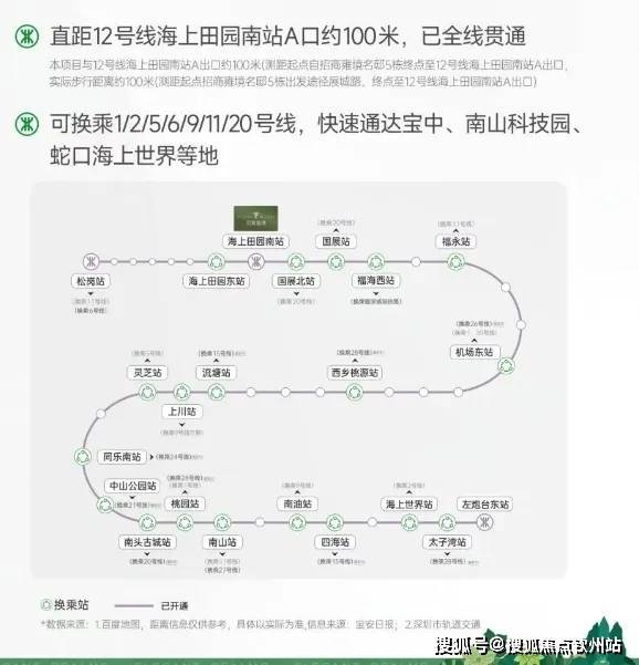 项目紧邻地铁12号线海上田园南站,步行距离仅约50-100米,从A口出站即可直达社区,真正实现“地铁口零距离”[7]。12号线作为深圳西部交通大动脉,可直达宝安中心、南山科技园等核心区域,换乘1、2、5、9、11、20号线等多条线路,实现全城便捷通勤[6][7]。