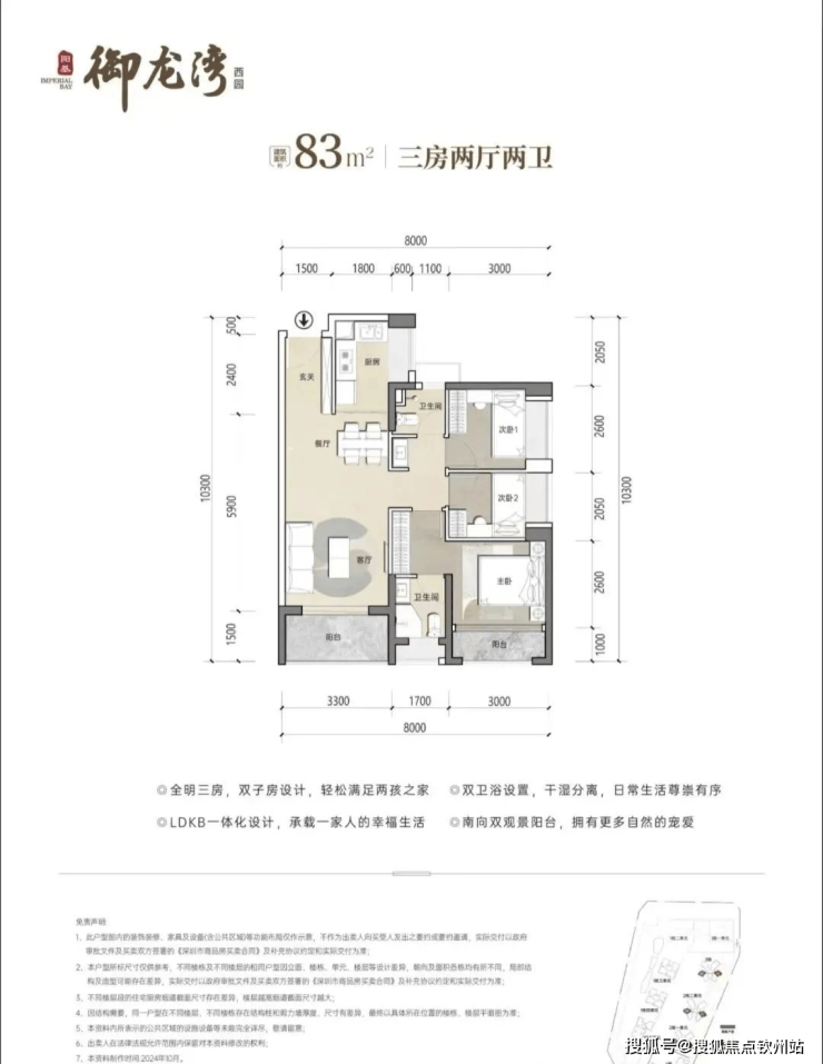 83㎡3房2卫,分布在2栋1/2单元02/05户型,设计的是竖厅格局,客厅开间3.3米,LDKB一体化设计,三开间朝南,U型厨房,公卫三段式分离设计!