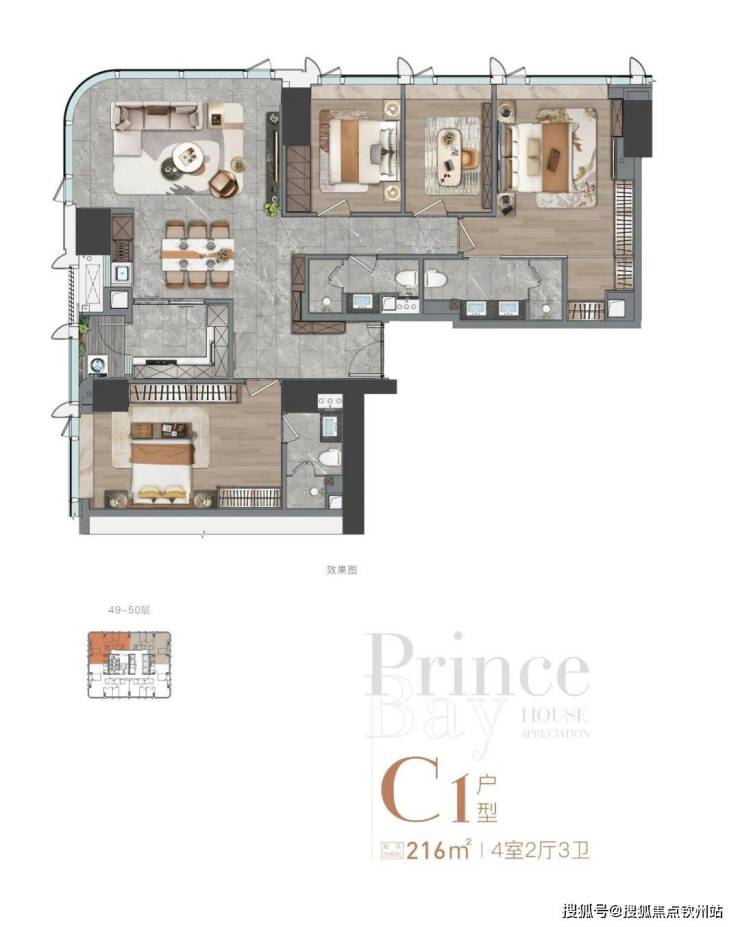 东北、西北向(49-50层)C1户型,216㎡ 4室2厅3卫,相比小面积,大面积的厨房是封闭式的,有两个主卧套房!