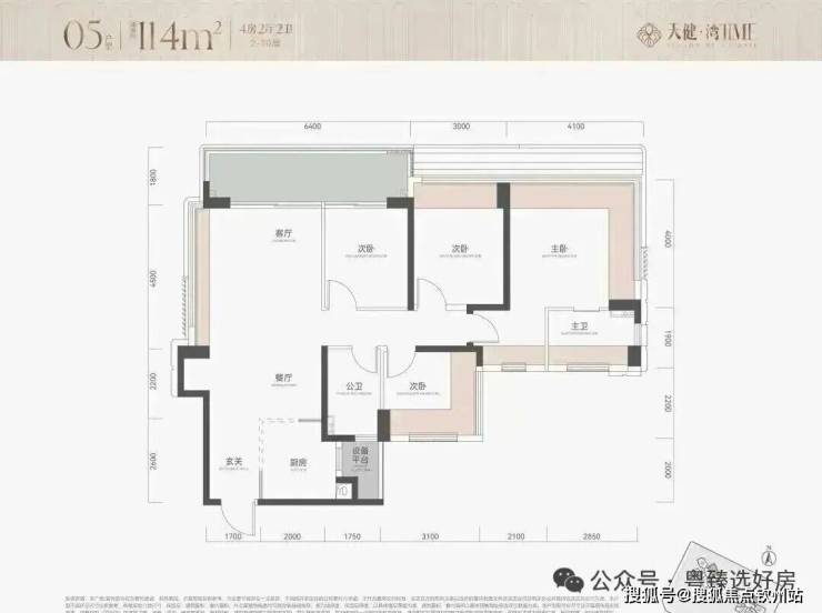 114㎡4房2卫,竖厅户型,朝北对着金众,户型结构和113完全一样,就是客厅也做了一面4.5米宽的凸窗;
