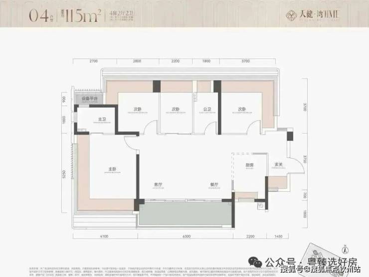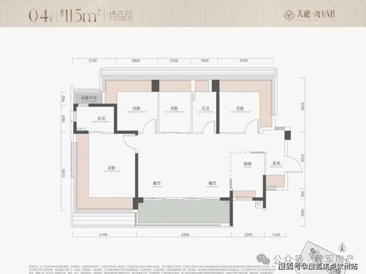 115㎡4房2卫,横厅户型,朝南看海,入户独立玄关,但三个次卧朝北;