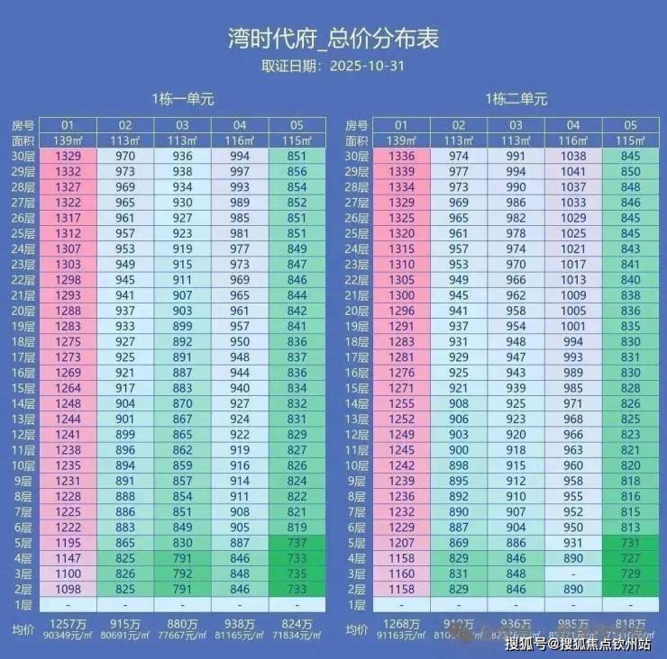 139㎡:2单元01户型(7.84万/㎡)大于1单元01户型(7.77万/㎡),价差约1000元/㎡;