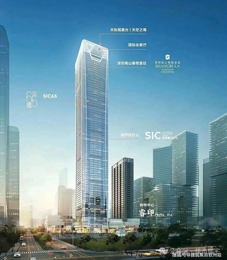 358米深圳第九高楼,深超总片区首个TOD商务综合体,集购物中心、五星级酒店、超甲级办公及私邸于一体,定位“全球城市灯塔地标”