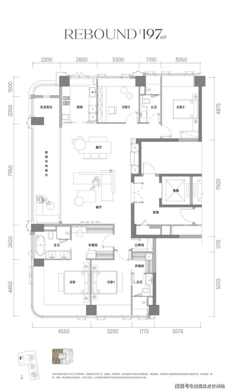 197㎡的4房2厅3卫,设计的是竖厅双龙抱珠格局,一梯一户,专梯入户设计,赠送私用电梯厅,客餐厅7.95米开间,LDKB一体化设计,四开间朝南,分别做到了主卧28.2㎡/次卧套间18.3㎡/次卧14.87㎡/次卧11.71㎡(包含墙体飘窗),客厅连接餐厅出10米长的超大观景阳台约22平,U型厨房,卫生间干湿分离,得房率约100%(包含赠送),西南朝向。