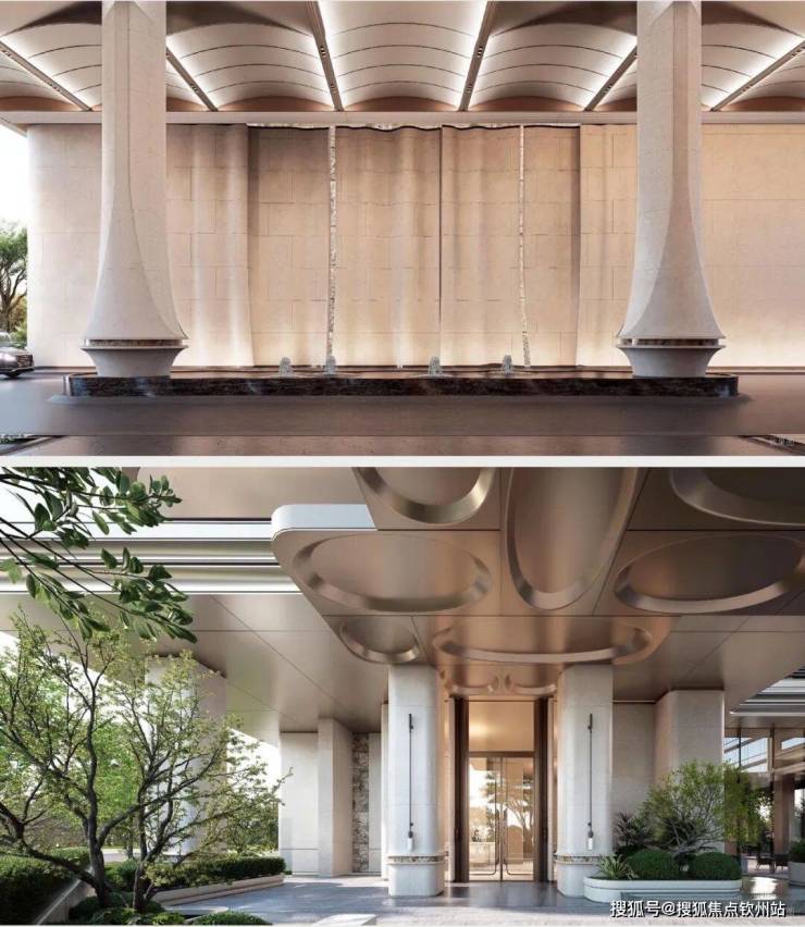 行大门做了殿堂级落客区,设有天幕和水景,非常具备归家仪式感。