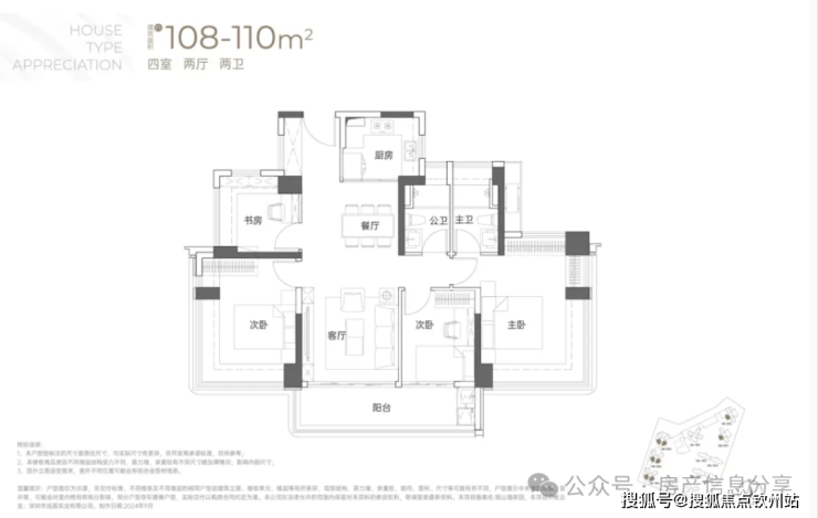 108-110㎡4房2卫户型:为西南向或东南向,竖庭设计,南北通透,阳台也是连通到次卧对出,比较宽敞。