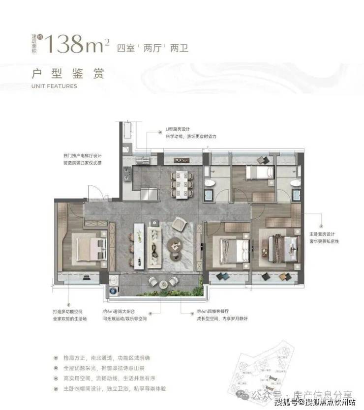 138㎡楼王户型:打造6.8米宽厅+双套房格局,客厅连接约7.2米景观阳台,实现山海景观最大化导入。主卧采用270°转角飘窗,配备独立衣帽间与明卫,打造酒店式居住体验。采用2梯2户专梯入户设计,私密性与尊崇感并存。