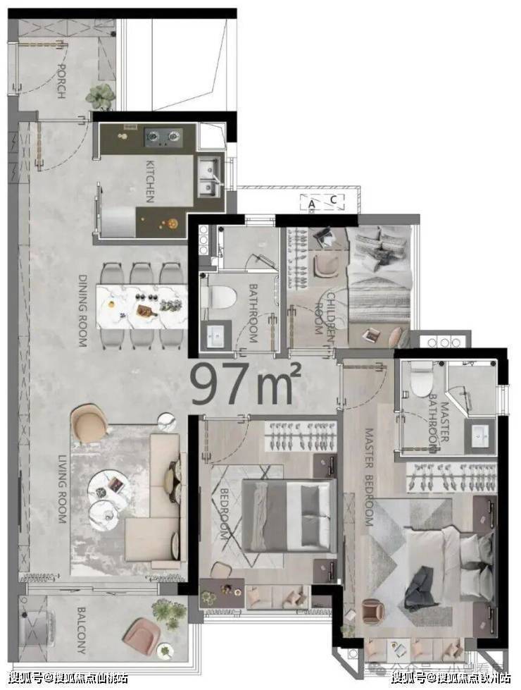 C 户型则多了个入户花园,厨房操作台更大,不过采光相对弱一些,购房者可以根据自己对阳台和采光的需求选择。这个面积段的户型动静分区明确,次卧空间刚好能放下儿童床,适合三口之家长期居住。