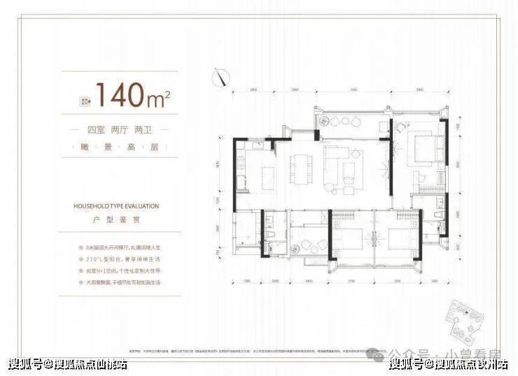 另外还有140㎡的四房户型,采用横厅设计,南北对流,北向主阳台望公园,南向卧室飘窗看小区园林,只是目前剩余房源已经不多,价格也相对更高一些。